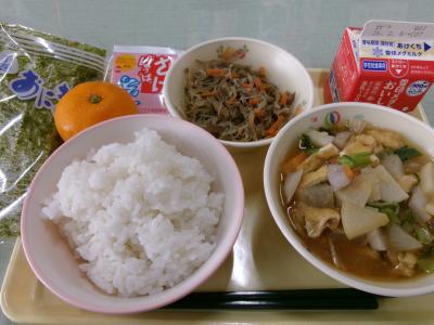 今日の給食は地元野菜たっぷりの神奈川県産品給食。みかん、きんぴら、里芋の味噌汁などなど。味噌は座間産大豆を使った手作りみそ。絶品です。