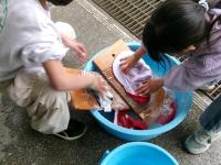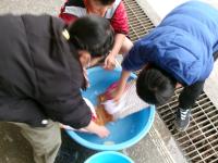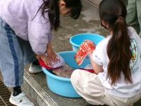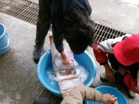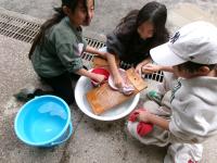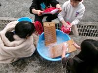 3年生が手洗いのせんたく体験をしました。洗濯板でゴシゴシ。洗濯板を使ったことがないと思ったら、「つかったことあるよー」と言う子がちらほらいてびっくり。今日はあいにくの曇りなので、「水、つめたーい!」と言いながら、楽しく洗濯していました。昔の人の苦労と現代の便利さを感じたかな?